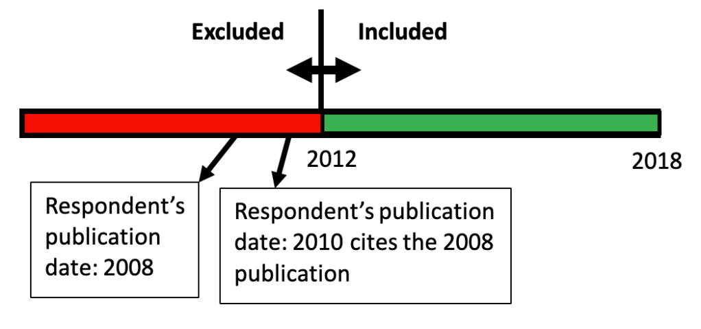 上方 B 圖的情況是,同樣是被檢舉人在 2018 年被檢舉,其在 2008 年所發表的論文,可能涉及不當研究行為,然而他最後一次引用這篇 2008 年論文的年度是 2010 年,之後自己就沒有再引用過這篇文章了;由於 2010 年的最後一次使用,距今已超過六年,所以不符合「繼續使用例外」,故接獲檢舉的機構不用處理此案。