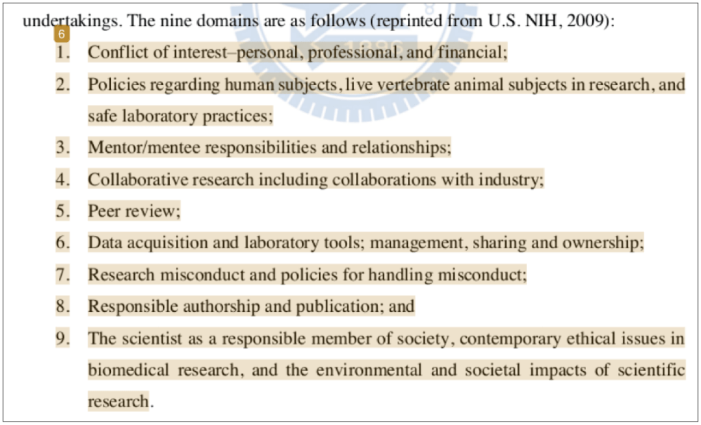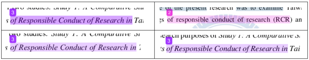 情況 1:有時會比對出一些不具抄襲意義的詞彙與文句,如:長字詞的專有名詞、常用詞句、機構名稱、參考書目等)。當這些不具抄襲意義的詞彙、書目資料等,反覆出現在文稿中時,無形中就可能提高相似度百分比數值。以下面這篇文章為例,每當提到專有名詞 responsible conduct of research(負責任的研究行為)時,該詞彙就會被標記與其他論文雷同。