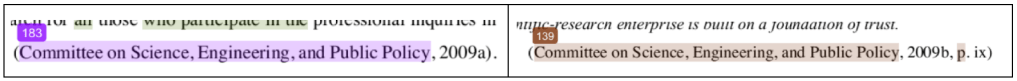另以下面這篇文章為例,當引用到團體名稱「科技、工程與公共政策委員會」(Committee on Science, Engineering, and Public Policy)的原文時,委員會的名稱也會被註記為雷同。