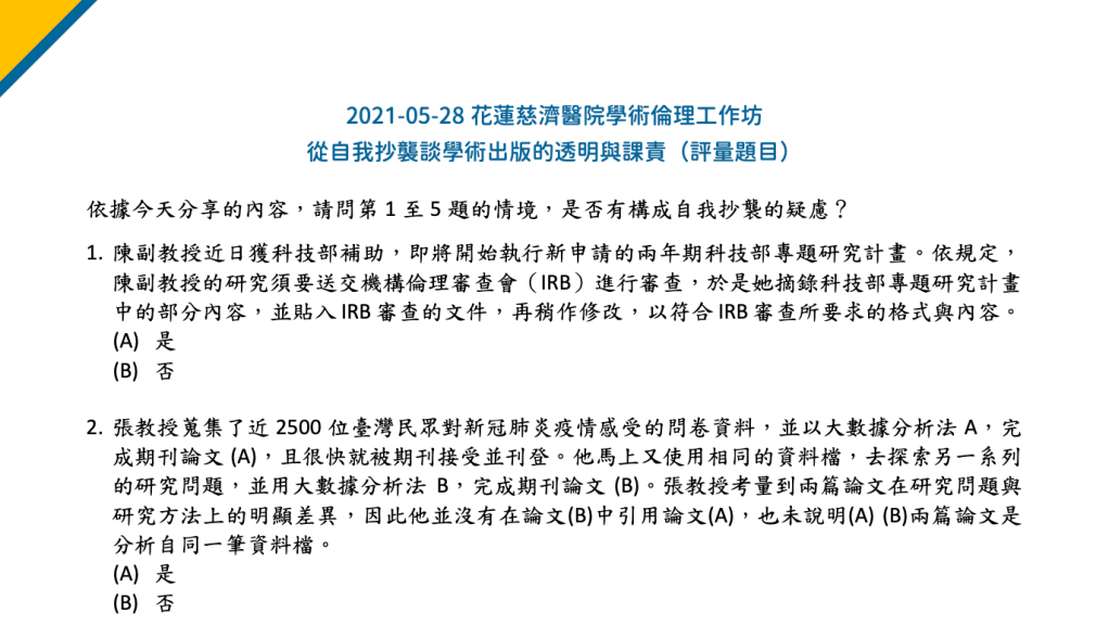 建議引用方式:潘璿安(2021年5月28日)。從自我抄襲談學術出版的透明與課責〔評量試題〕,花蓮慈濟醫院學術倫理工作坊視訊演講。