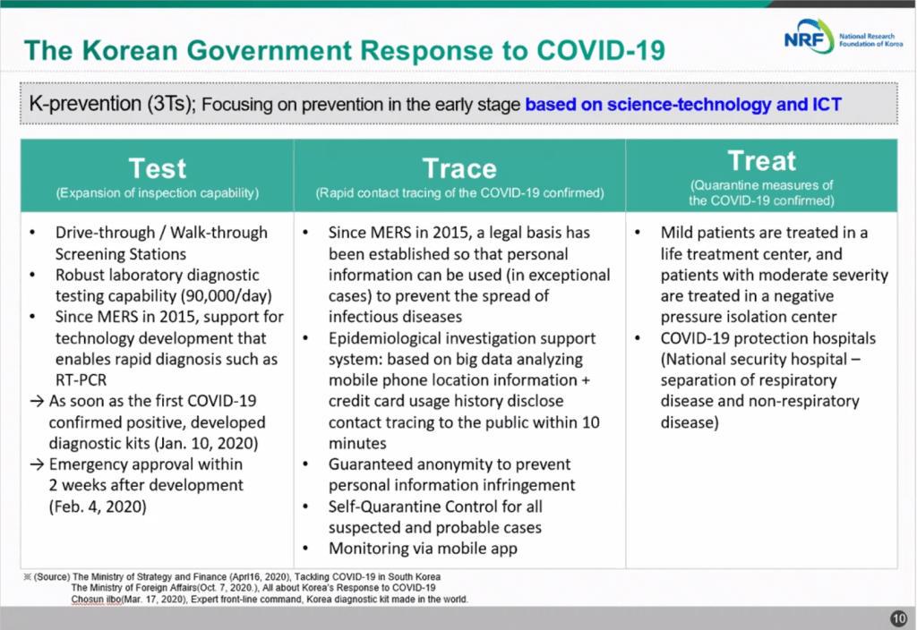 NRF 主席 Roe 教授在開場的專題演說中,代表政府歡迎與會者,並首先分享韓國政府針對新冠肺炎疫情之大流行,所積極採取的防疫措施。當中提到,韓國政府是採用 3Ts(Test, Trace, and Treat;檢測、追蹤與醫治)作為抗疫的策略(圖 1);這當中的許多設施、防疫機制與措施,是在 2015 年為了因應當年的 MERS 疫情所建置出來的。首先,在檢測(Test)部分,韓國在 2015 年時就著手建置快速篩檢的設備與環境,因此在這次新冠肺炎疫情蔓延之初,他們才得以用最短的時間通過緊急授權,並立即啟動這些快速篩檢措施。而在追蹤確診者(Trace)的部分,韓國在 2015 年即開始著手制定個人資料使用的相關法規,當中授權政府可以在緊急情況時(如這次的疫情期間),利用民眾的個人電子設備(如智慧型手機)與即時交易(如信用卡刷卡記錄)去追蹤他們的足跡;這個授權讓防疫人員可以在短短 10 分鐘內即有效掌握確診者的行蹤。當然,政府也保證他們不會利用這些授權去侵害人民的生活隱私。此外,韓國政府對於確診者的醫治(Treat)是採分流的方式進行,包括將輕症患者與中重度患者安置於不同類型的醫療機構,確保彼此不會相互影響。整體而言,韓國的防疫措施是快速且有效的,而這可以歸功於他們過去於 MERS 疫情期間在軟體(規劃制度與法規)與硬體(採購防疫設備)投入與設置方面的努力。
