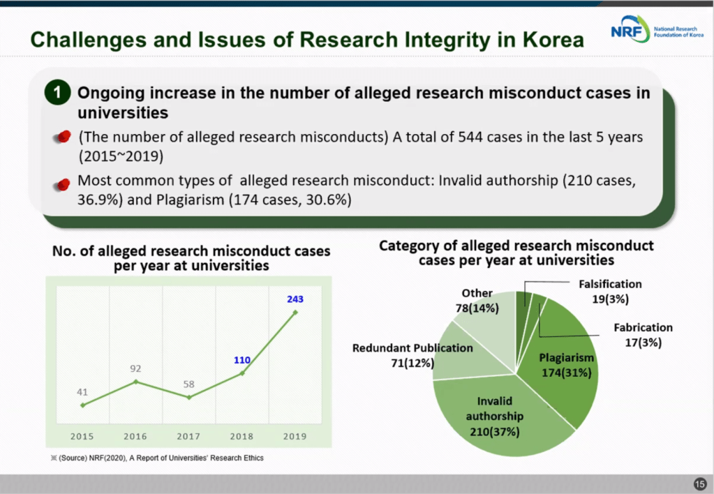 在演講中,Roe教授也呈現了 NRF 在 2015 年至 2019 年間,所收到之疑似不當研究行為通報事件的態樣分析(圖 3)。從 Roe 教授所提供的資料可看出,在所有 544 件被通報的案件中,不當掛名情事以 210 件占最大宗,其次是抄襲(174 件)。這份態樣分析與其他國家(包括美國、臺灣)的案件分析結果非常不同,是少見(甚至可能是首見)以不當掛名為通報最大宗的報告。Roe 教授指出,這些被通報的案件包含許多 19 歲以下青少年涉及不當掛名的事件。究其原因,主要是這些青少年為了豐富自己升大學時所需的學習歷程檔案,因此掛名在父母、親友或其他關係人的學術論文中,以增加錄取大學的機會。