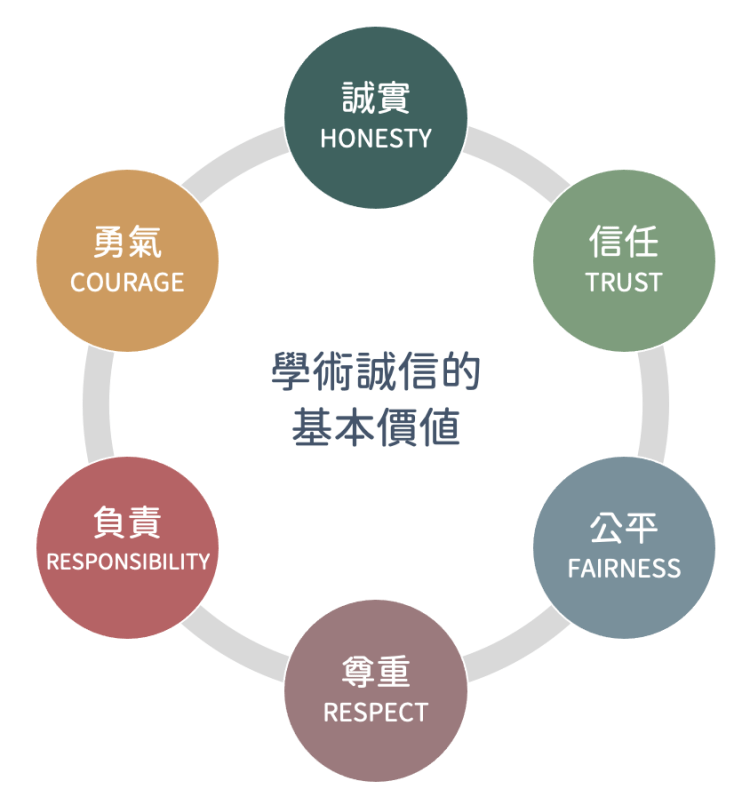 參考文獻:本文對六項基本價值的解釋,主要參考自 International Center for Academic Integrity (ICAI). (2021). The fundamental values of academic integrity. (3rd ed.). https://academicintegrity.org/images/pdfs/20019_ICAI-Fundamental-Values_R12.pdf