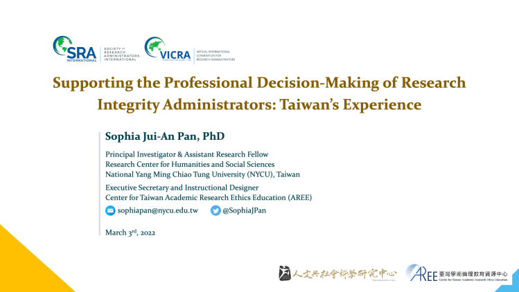 Recommended citation format (APA): Pan, S. J.-A. (2022, March). Supporting research integrity administrators’ professional decision-making: Taiwan’s experience. Presented at the 1st Inaugural Virtual International Convention for Research Administrators (VICRA), Society of Research Administrators International (SRAI), Virginia, USA [virtual conference]. March 1–3, 2022.