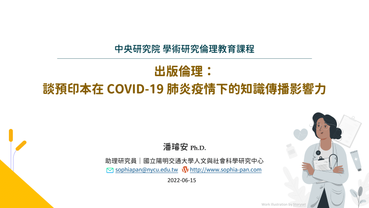 建議引用方式:潘璿安(2022年6月15日)。出版倫理:談預印本在 COVID-19 肺炎疫情下的知識傳播影響力〔簡報〕。2022 中央研究院學術研究倫理教育課程〔視訊〕。