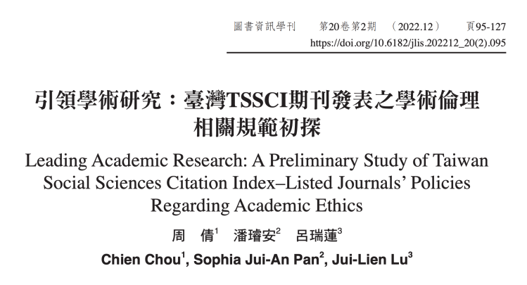 Chou, C., Pan, S. J.-A., & Lu., J.-L. (2021). Leading academic research: A preliminary study of Taiwan Social Sciences Citation Index–listed journals’ policies regarding academic ethics. Journal of Library and Information Studies, 20(2), 95–127. https://doi.org/10.6182/jlis.202206_20(1).069 [Published in Chinese with an extended English summary]