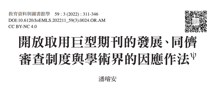 建議引用格式:潘璿安(2022)。開放取用巨型期刊的發展、同儕審查制度與學術界的因應作法。教育資料與圖書館學,59(3),311–346。https://doi.org/10.6120/JoEMLS.202211_59(3).0024.OR.AM