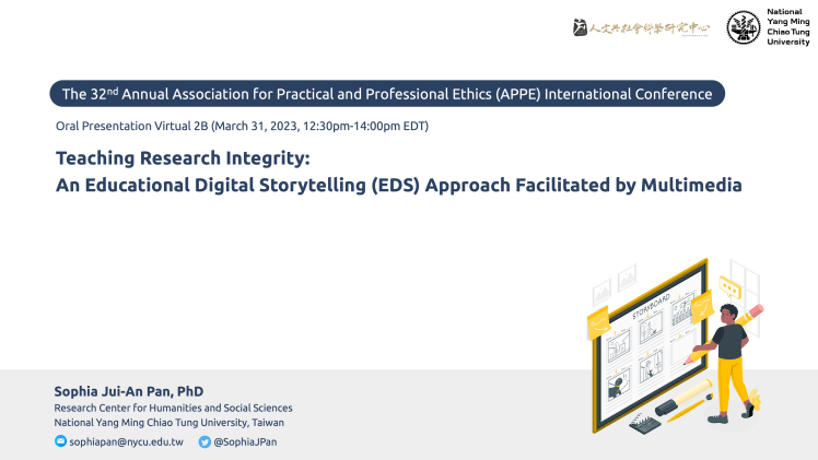Recommended citation format (APA): Pan, S. J.-A. (2023, March 31). Teaching research integrity: An educational digital storytelling approach facilitated by multimedia [Paper presentation]. The 32nd Annual APPE (Association for Practical and Professional Ethics) International Conference, Portland, OR, United States [One-day virtual conference]. https://doi.org/10.5281/zenodo.7754930